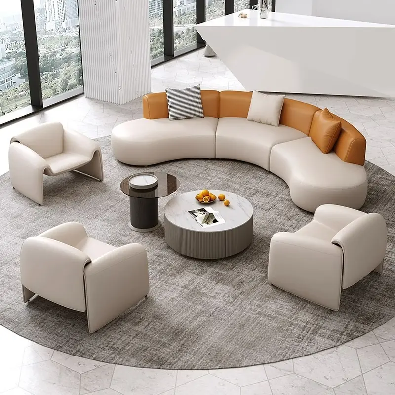 Bộ ghế sofa bọc da dáng cong hiện đại được thiết kế độc đáo với đường cong mềm mại hình chữ C, vừa tạo điểm nhấn nghệ thuật vừa mang lại sự sang trọng cho phòng khách. Đây là lựa chọn hoàn hảo cho không gian biệt thự, căn hộ cao cấp hay phòng khách hiện đại.
