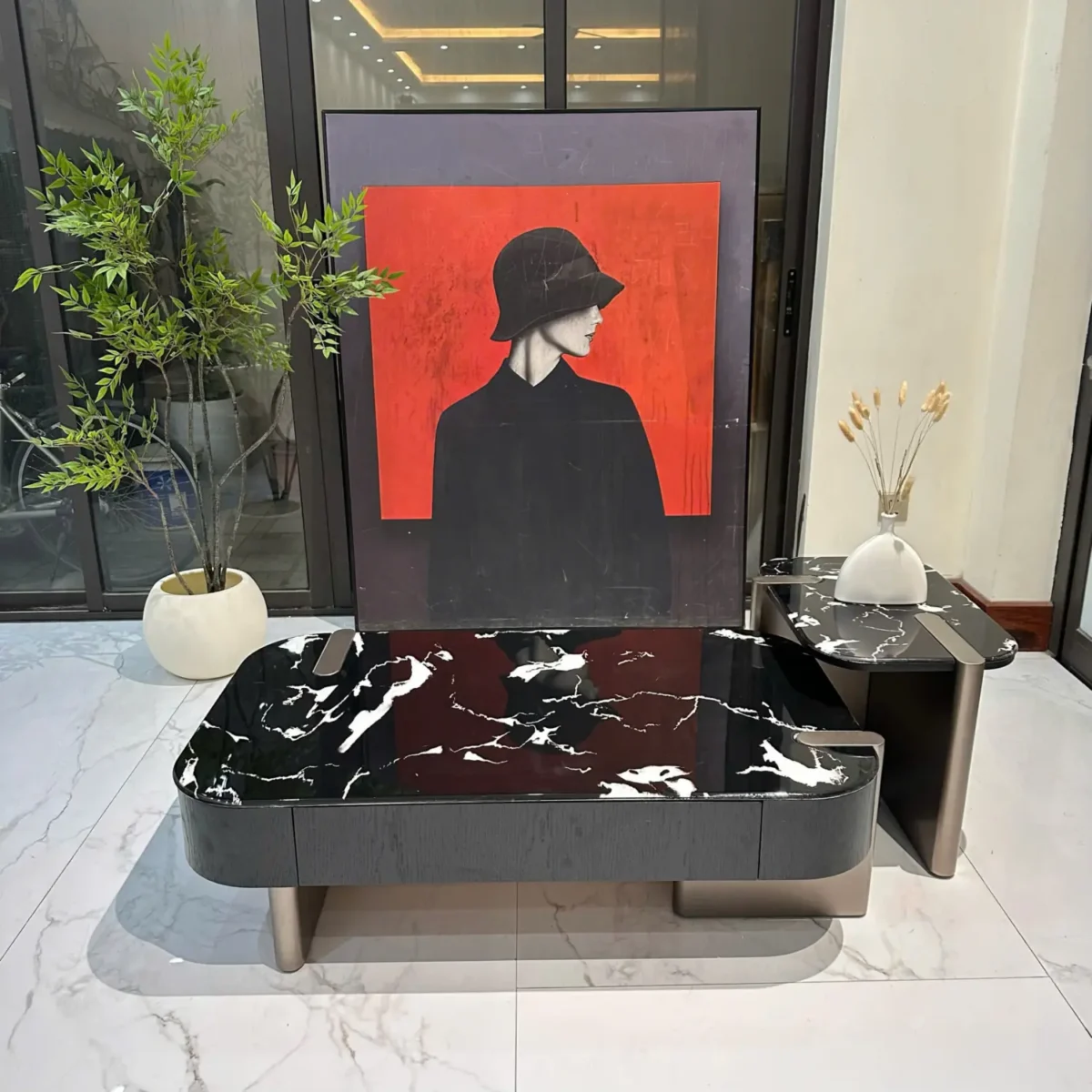 Bộ bàn trà kết hợp kệ tivi mặt đá cẩm thạch đen vân mây nhập khẩu cao cấp là lựa chọn hoàn hảo cho nội thất phòng khách. Thiết kế hiện đại, đường nét thanh thoát cùng chất liệu đá cẩm thạch sang trọng giúp không gian thêm đẳng cấp và thời thượng.
