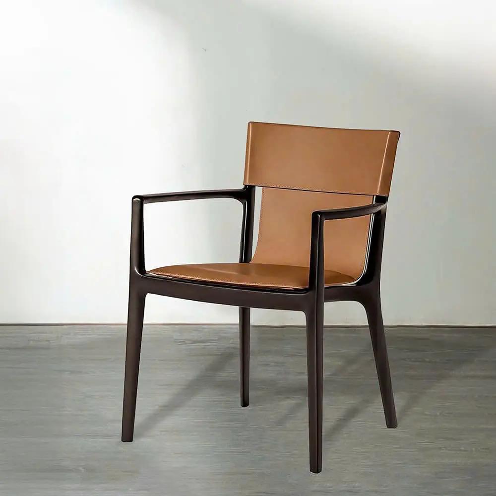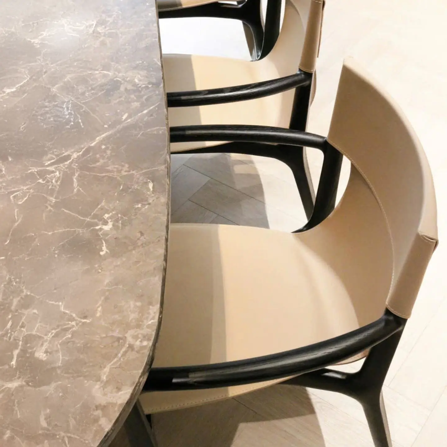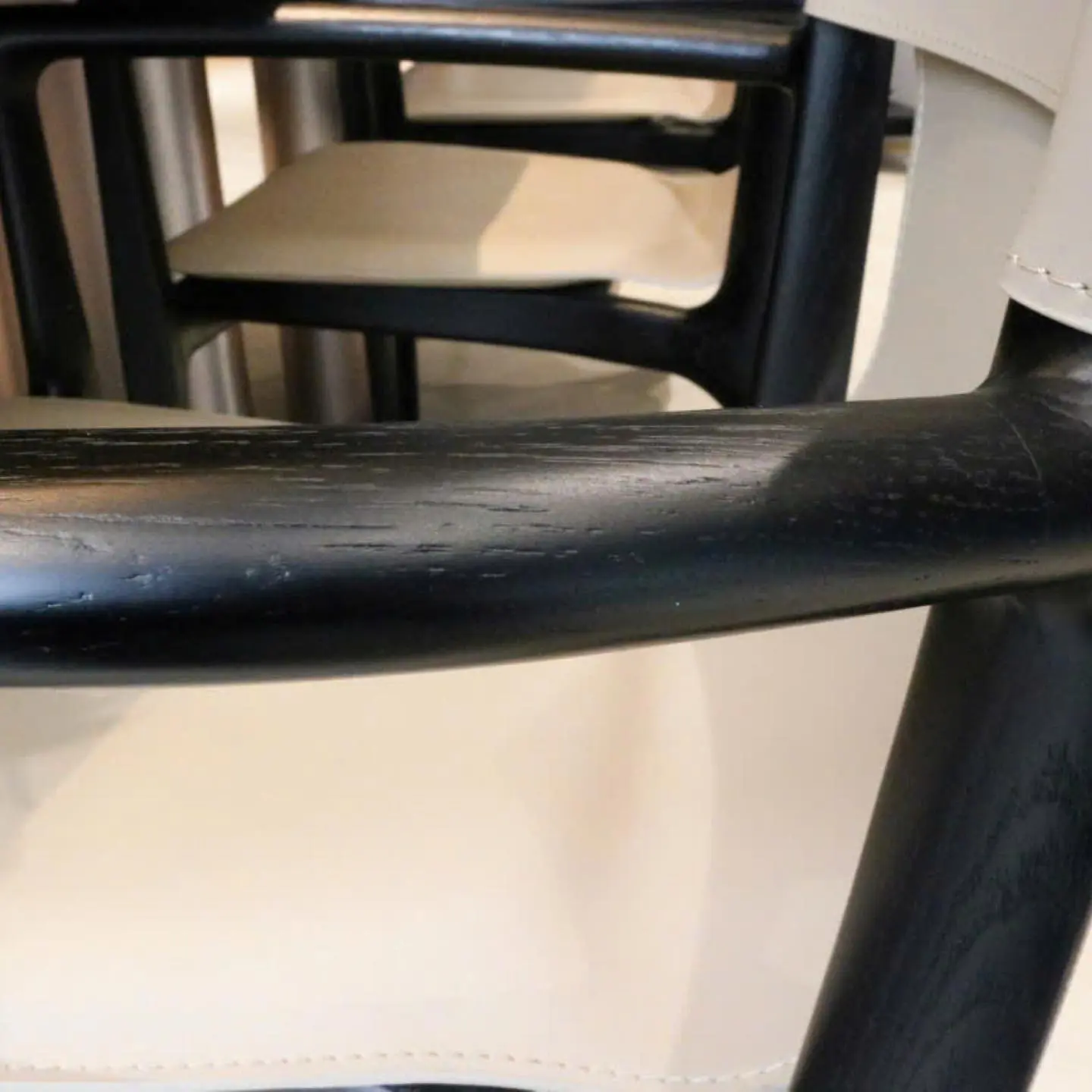 Phần tựa lưng và mặt ngồi bọc da bò thật thuộc da yên ngựa cao cấp, mềm mại, êm ái và có khả năng chống nước tốt. Thiết kế lưng ghế thẳng hiện đại, kết hợp với chiều cao chuẩn giúp bạn ngồi thoải mái trong suốt bữa ăn. Kích thước gọn gàng 49 × 57 × 81 cm, rất phù hợp với bàn ăn từ 4 đến 6 người mà không chiếm quá nhiều diện tích.