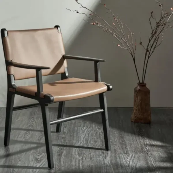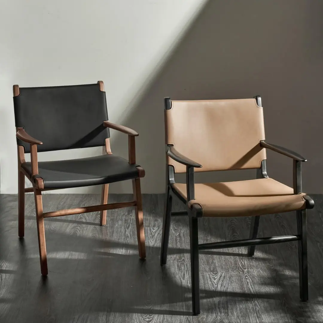 Phần tựa lưng và mặt ngồi bọc da bò thật thuộc da yên ngựa cao cấp, mềm mại, êm ái và có khả năng chống nước tốt. Thiết kế lưng ghế thẳng hiện đại, kết hợp với chiều cao chuẩn giúp bạn ngồi thoải mái trong suốt bữa ăn. Kích thước gọn gàng 59 × 52 × 86 cm, rất phù hợp với bàn ăn từ 4 đến 8 người mà không chiếm quá nhiều diện tích.