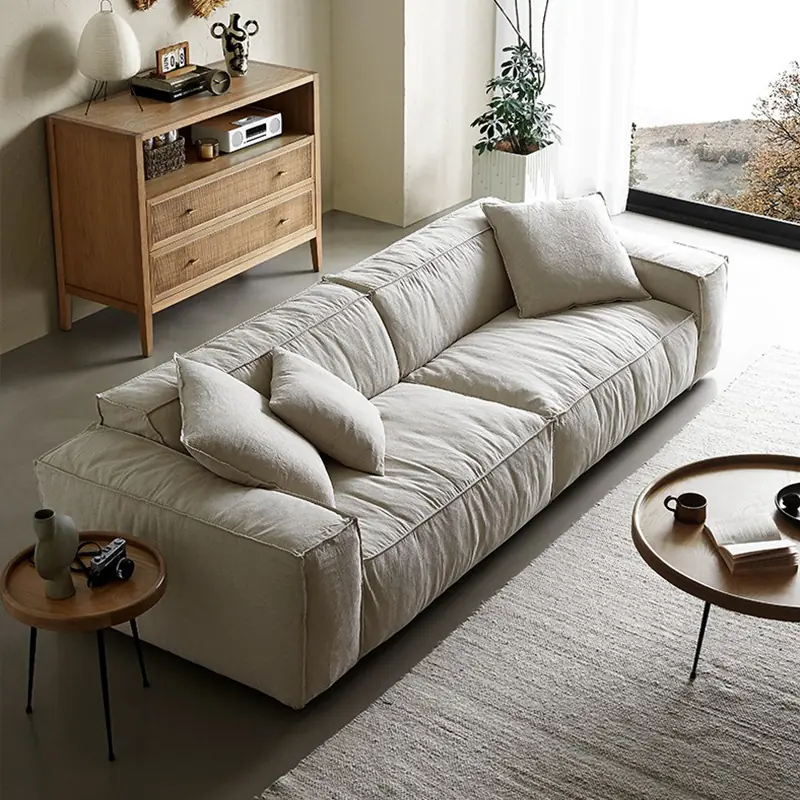 Ấn tượng đầu tiên của mẫu sofa này nằm ở thiết kế băng dài thanh thoát, các đường nét mềm mại kết hợp cùng tone màu vải trung tính tạo cảm giác ấm áp và dễ chịu. Sofa không quá cầu kỳ nhưng vẫn đủ sang trọng để trở thành điểm nhấn tinh tế cho tổng thể phòng khách.