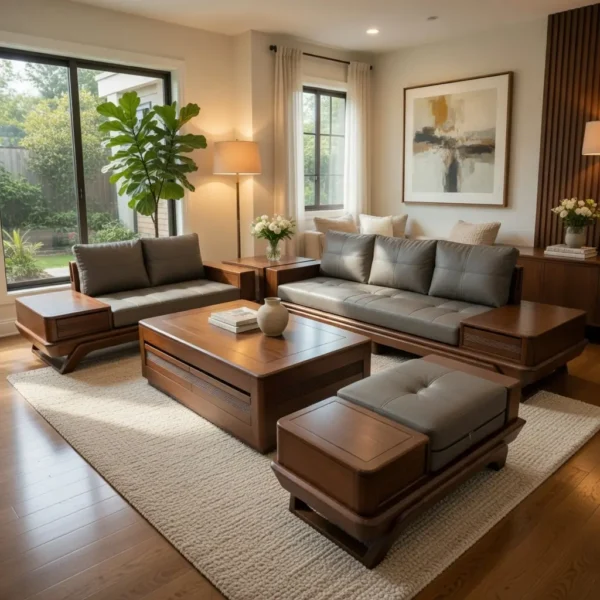 Form vuông vức hiện đại; màu gỗ trung tính dễ phối nội thất; phù hợp nhiều không gian như nhà phố, nhà vườn, chung cư hoặc phòng khách rộng.