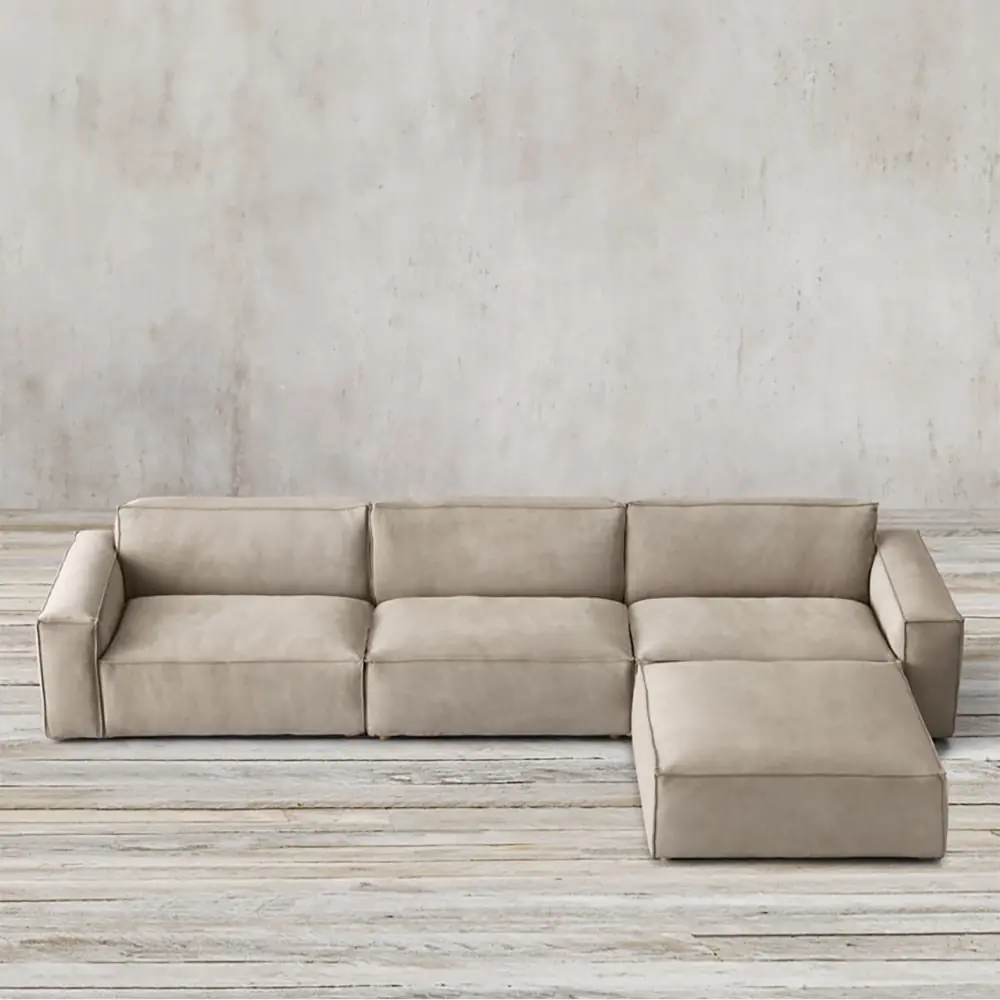 Kiểu dáng: Sofa chữ L dáng hộp hiện đại, tay vịn vuông vức, form rộng thoải mái, dễ phối hợp với bàn trà hoặc nội thất phòng khách.