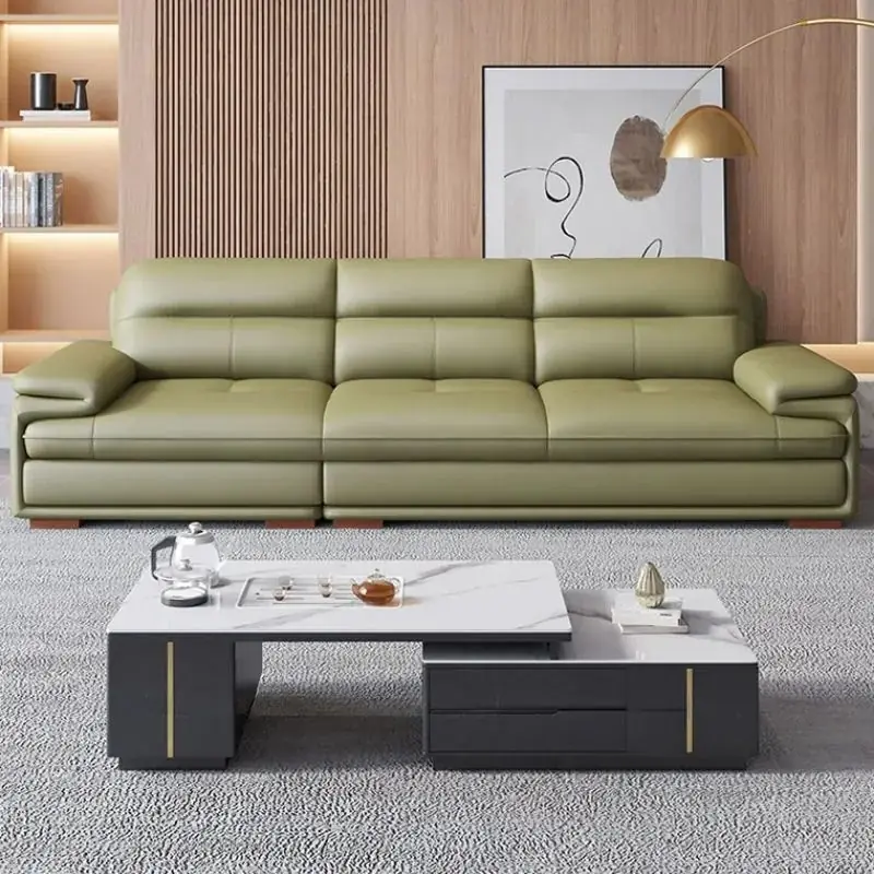 Sofa sử dụng các dòng da chất lượng cao với nhiều tùy chọn linh hoạt. Da PU cao cấp có ưu điểm chống thấm, dễ vệ sinh và giá thành hợp lý. Da Microfiber mềm mịn, thoáng khí, cảm giác sử dụng gần giống da thật và có độ bền cao. Đối với khách hàng yêu cầu cao về đẳng cấp, sofa có thể bọc da bò thật nhập khẩu từ Italy hoặc Brazil, mang lại vẻ đẹp sang trọng tự nhiên và tuổi thọ sử dụng lên đến 10–15 năm.