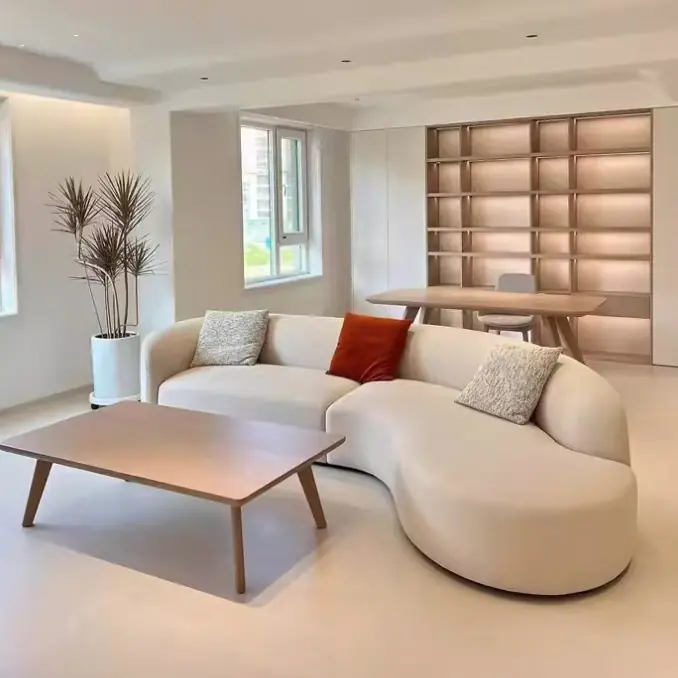 Ghế sofa vải dáng cong hiện đại mang đến vẻ đẹp mềm mại và nghệ thuật, tạo điểm nhấn độc đáo cho phòng khách. Thiết kế bo tròn uốn lượn tinh tế không chỉ mở rộng không gian mà còn đem lại sự thoải mái tuyệt vời khi ngồi nghỉ ngơi.