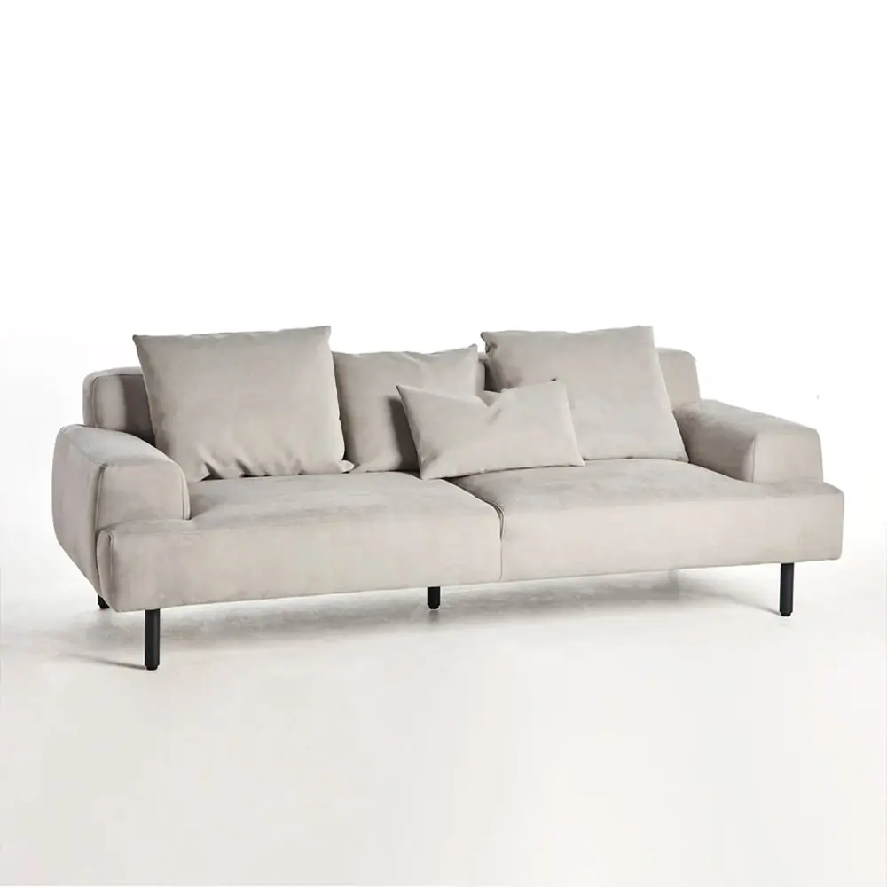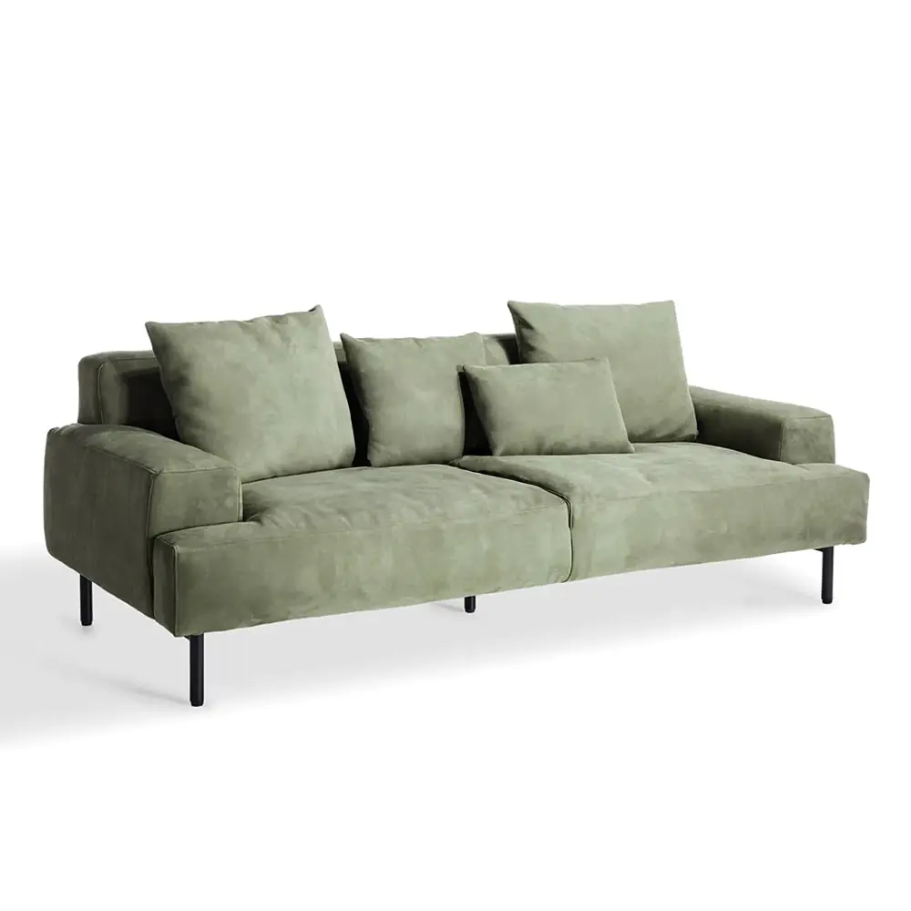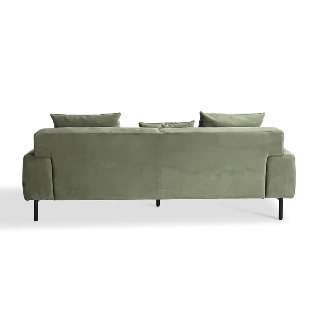 Kiểu dáng: Sofa văng 3 chỗ, tay vịn gọn, tựa lưng rời kèm nhiều gối êm ái & hỗ trợ thoáng gầm – dễ vệ sinh, hút bụi.