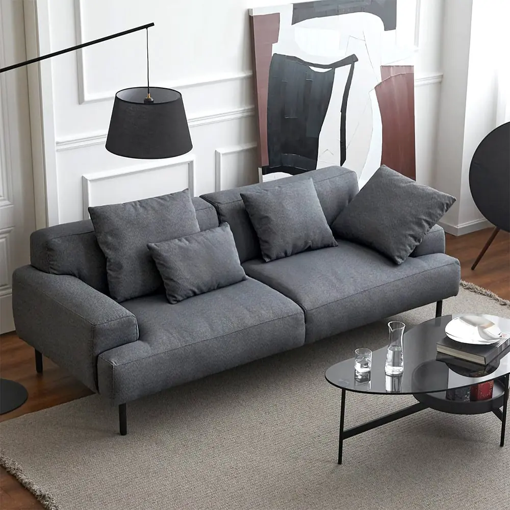 Kết hợp cùng đèn trang trí tông đen và thảm trải sàn sợi ngắn giúp tôn rõ tone xám đậm của sofa; hoặc thêm gối tựa lưng màu trung tính để tạo chiều sâu cho bố cục.