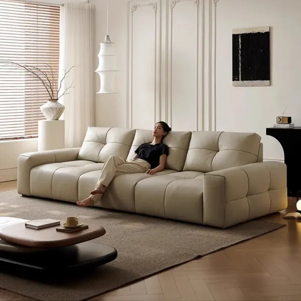 Ghế sofa văng da bo tròn êm ái là mẫu sofa phòng khách mang phong cách hiện đại và sang trọng. Thiết kế tay ghế bo tròn mềm mại kết hợp phần đệm chần múi dày giúp mang lại cảm giác thư giãn tối đa khi sử dụng. Kiểu dáng sofa dài giúp sản phẩm phù hợp với nhiều không gian phòng khách như căn hộ chung cư, nhà phố hoặc phòng khách hiện đại.