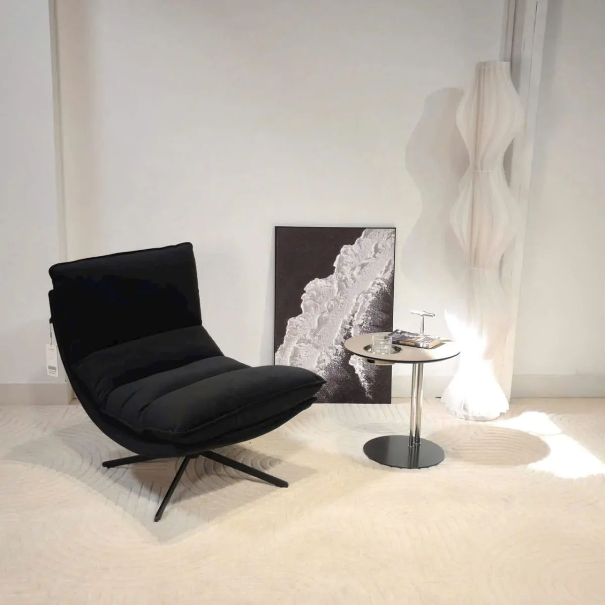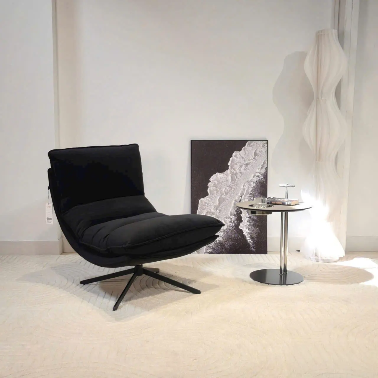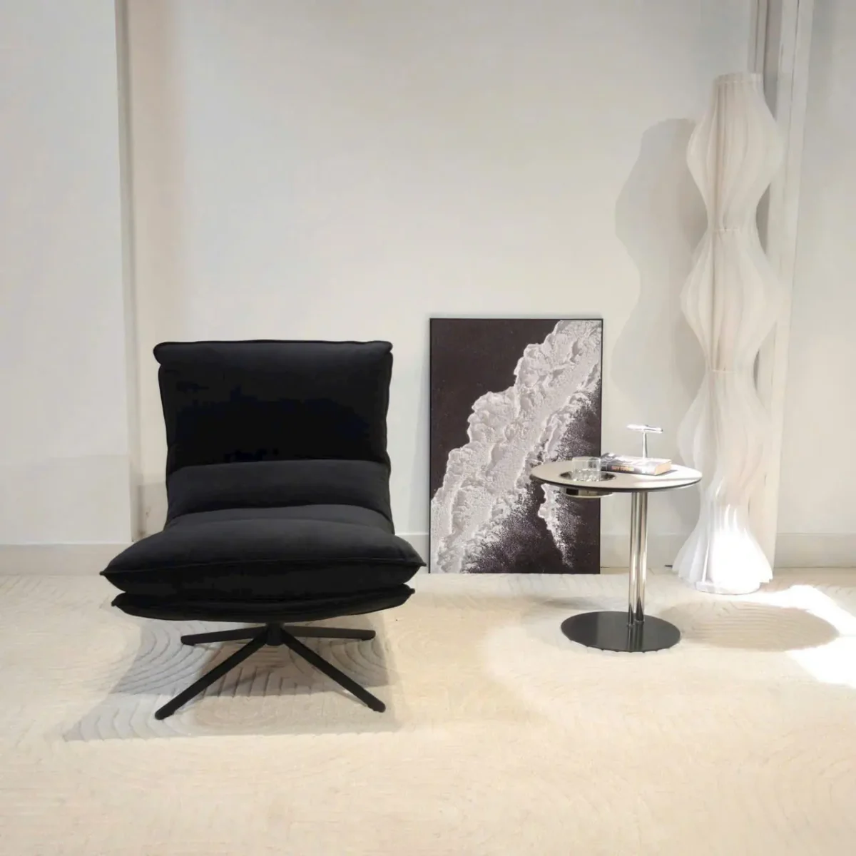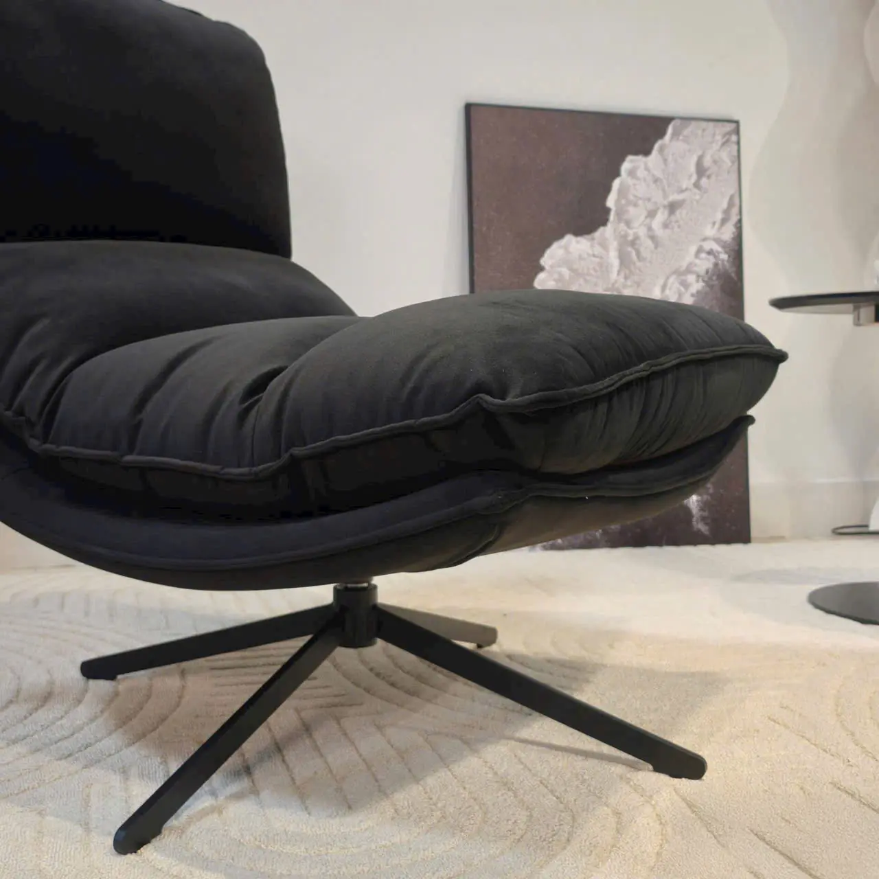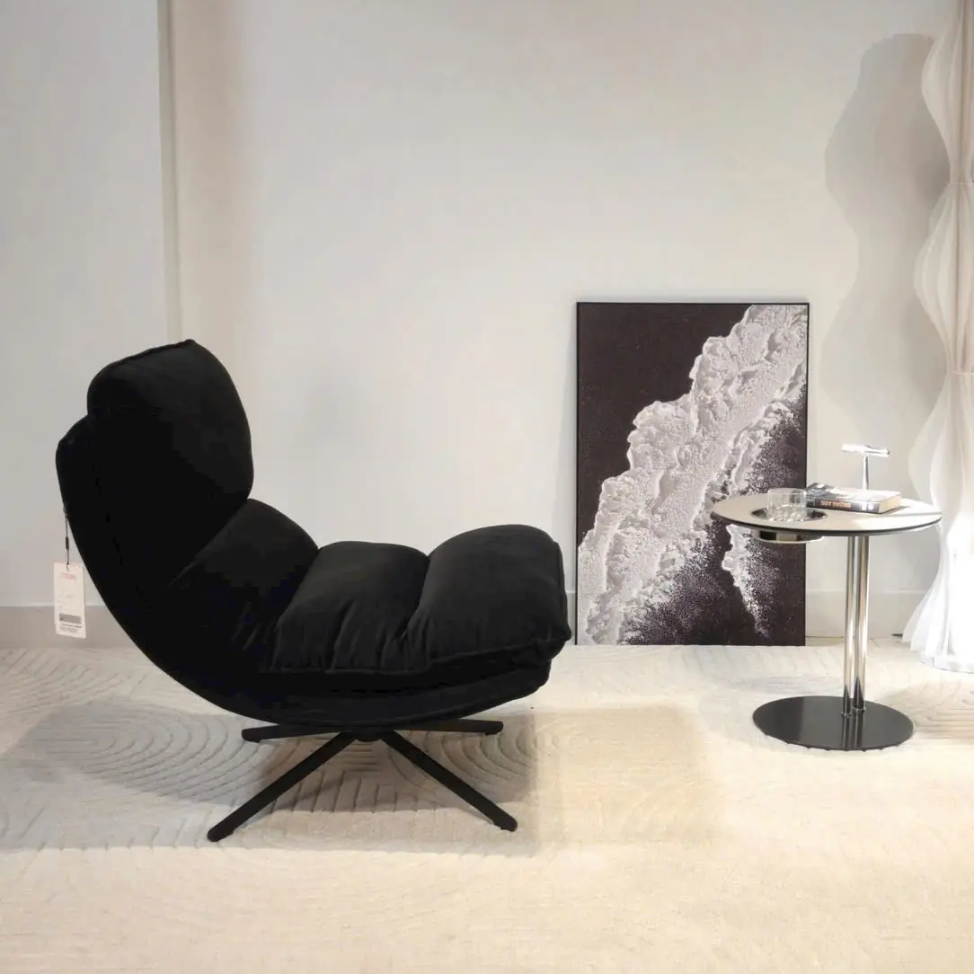 Phần chân ghế xoay bằng kim loại sơn tĩnh điện chắc chắn, cho phép người dùng linh hoạt xoay chuyển hướng ngồi mà vẫn đảm bảo độ ổn định. Khi kết hợp cùng bàn trà nhỏ hoặc đèn sàn, ghế trở thành điểm nhấn tinh tế cho không gian sống.