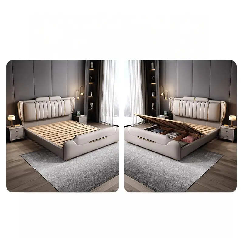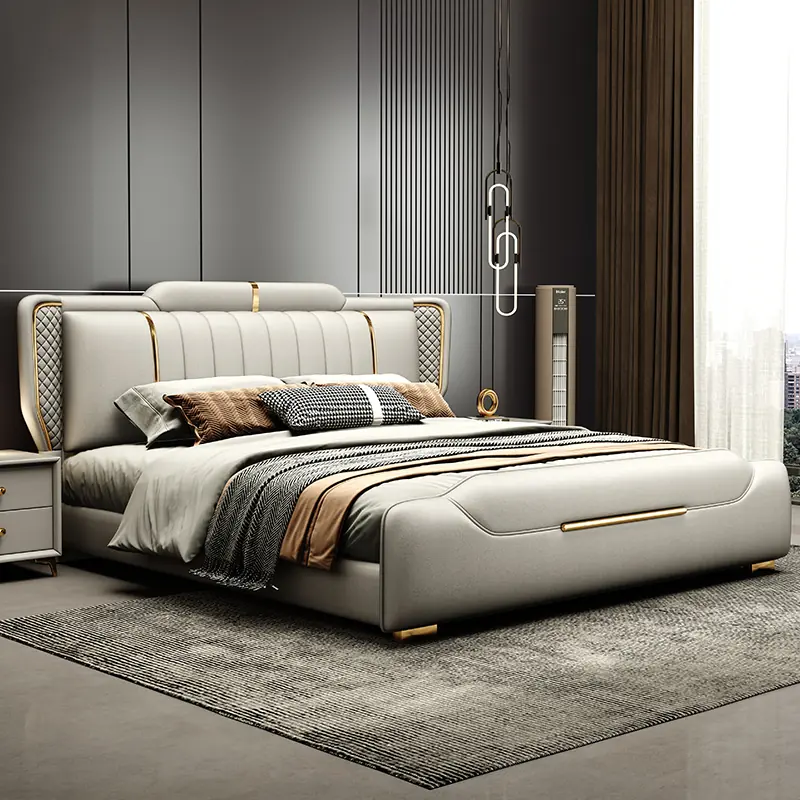 Ngay từ cái nhìn đầu tiên, sản phẩm gây ấn tượng mạnh với phần đầu giường bọc da liền khối, kết hợp chi tiết viền kim loại ánh vàng sang trọng, tạo cảm giác cao cấp như các mẫu giường trong khách sạn 5 sao. Tone màu kem – xám trung tính giúp giường dễ dàng phối hợp với nhiều phong cách nội thất khác nhau, từ hiện đại tối giản đến luxury nhẹ nhàng.