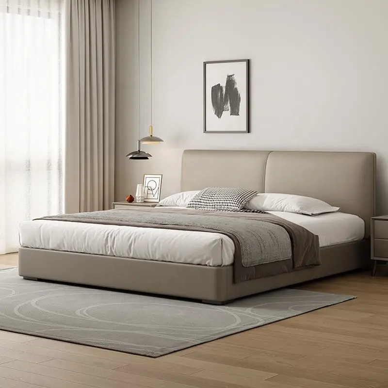 Phần đầu giường được thiết kế phẳng, bọc da cao cấp liền khối, viền gọn gàng tạo cảm giác chắc chắn và thanh lịch. Lớp đệm vừa phải giúp mang lại sự êm ái khi tựa lưng đọc sách, xem tivi hoặc nghỉ ngơi trước khi ngủ.
