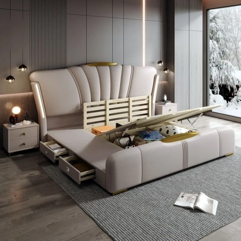 Toàn bộ thân giường được bọc da cao cấp với bề mặt mịn, độ đàn hồi tốt, hạn chế bong tróc và dễ dàng vệ sinh trong quá trình sử dụng. Da có khả năng giữ màu ổn định, không bám bụi, mang lại cảm giác êm ái khi tựa lưng hay nghỉ ngơi.
