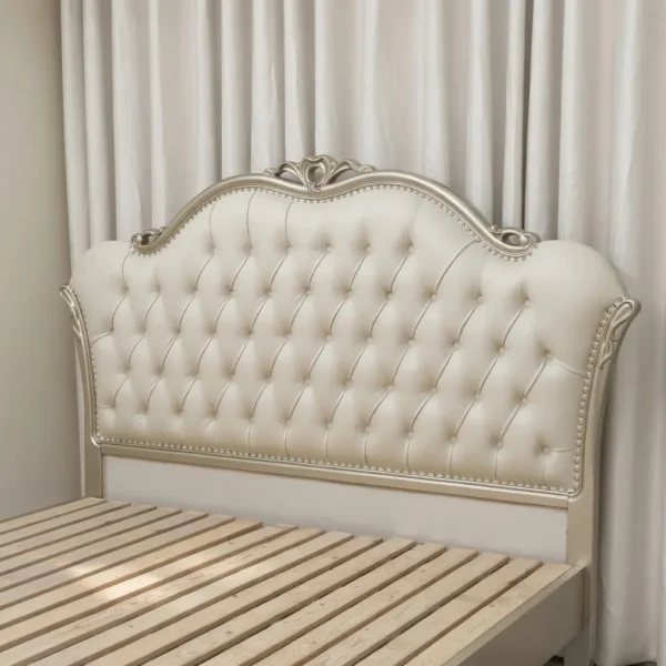 Đầu giường và chân giường được thiết kế uốn cong mềm mại với họa tiết chạm khắc hoa văn tinh xảo, viền đen mạ vàng óng ánh tạo điểm nhấn sang trọng vượt trội. Bề mặt bọc da PU mềm mại, êm ái, kết hợp nút bọc da tạo hiệu ứng tufted cổ điển. Khung giường làm từ gỗ tự nhiên chắc chắn, đảm bảo độ bền cao và chịu lực tốt.