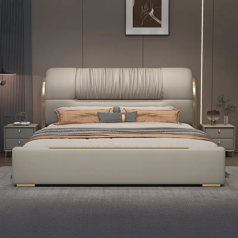 Với gam màu trung tính như be xám, giường ngủ bọc da viền mạ vàng dễ dàng kết hợp cùng tủ đầu giường, bàn trang điểm hay tủ quần áo trong không gian phòng ngủ hiện đại. Thiết kế tối giản giúp không gian trở nên gọn gàng, tinh tế nhưng vẫn giữ được sự ấm cúng cần thiết.