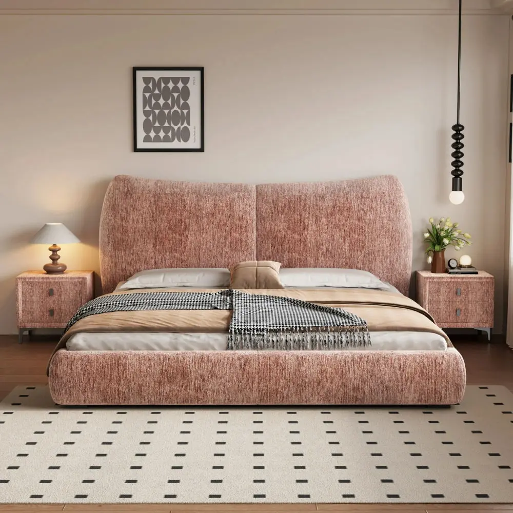 Giường Ngủ Bọc Vải Màu Hồng Đất Thiết Kế Cong Hiện Đại – Thanh Lịch & Sang Trọng