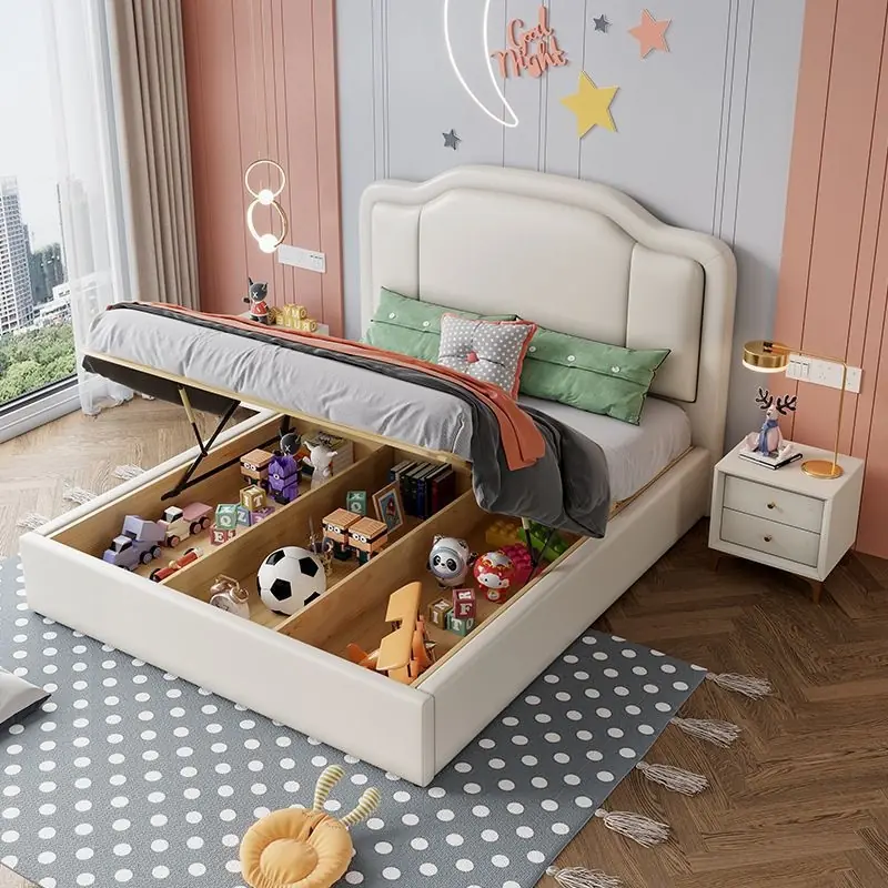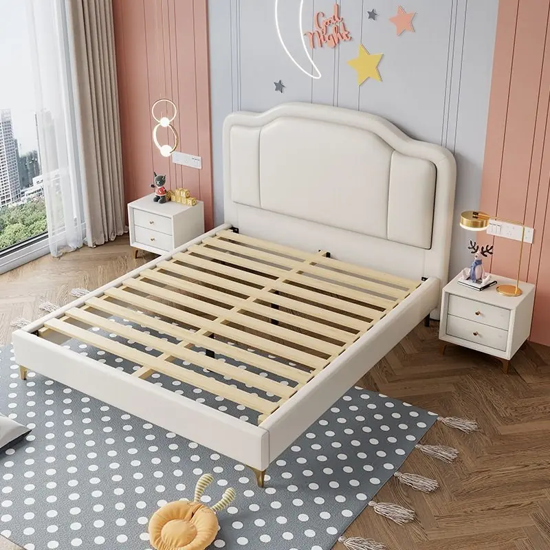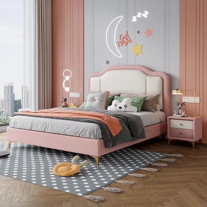 Phần đầu giường và khung giường được bọc nệm mút dày, kết hợp vải hoặc da cao cấp mềm mại, thân thiện với làn da nhạy cảm của trẻ. Lớp bọc nệm giúp tăng cảm giác êm ái khi bé tựa lưng, đồng thời giảm thiểu rủi ro va chạm.