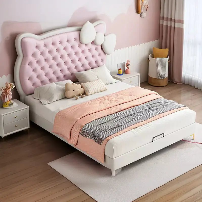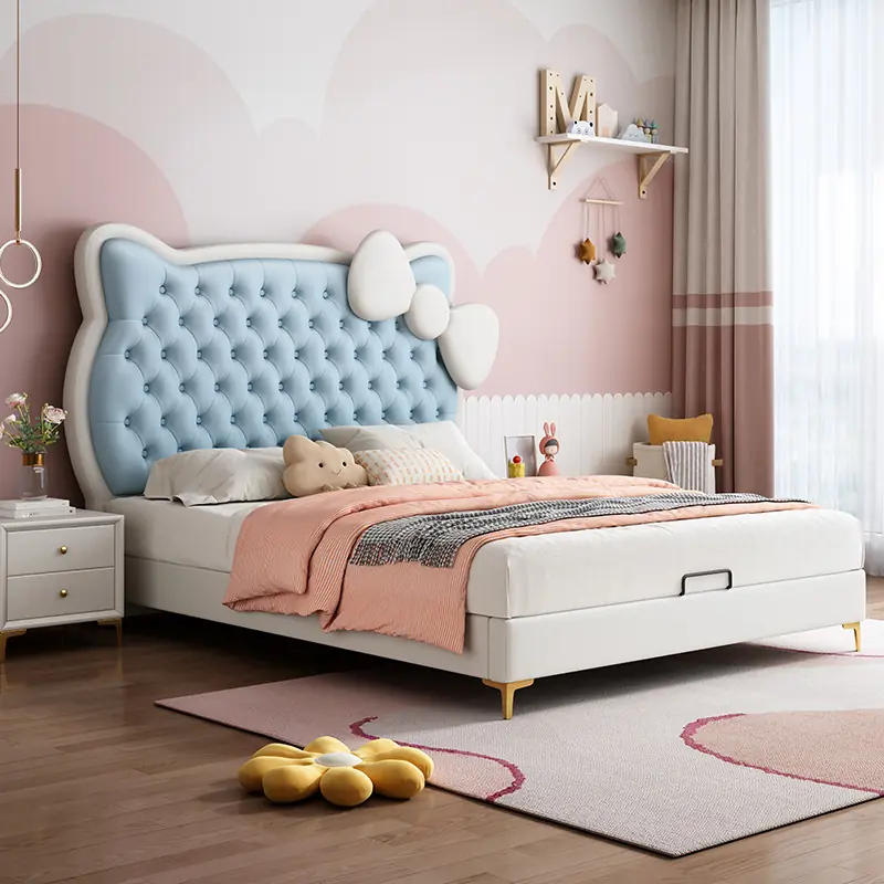 Một trong những điểm nổi bật của mẫu giường kitty là các chi tiết được bo tròn mềm mại, hạn chế tối đa cạnh sắc. Phần đầu giường bọc đệm dày giúp giảm va chạm, đặc biệt an toàn với trẻ nhỏ trong quá trình sinh hoạt hàng ngày.