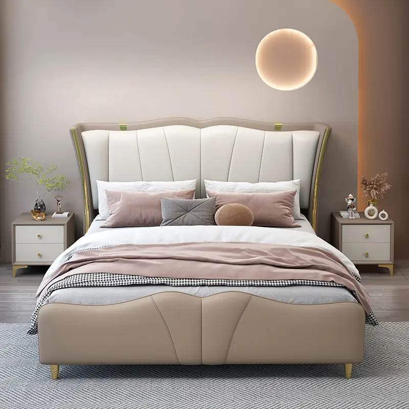 Giường ngủ sofa bọc da cao cấp là lựa chọn lý tưởng cho những ai yêu thích phong cách nội thất sang trọng, hiện đại nhưng vẫn đòi hỏi sự mềm mại và tinh tế. Thiết kế đầu giường bo cong rộng, chia line mềm mại kết hợp đường viền kim loại ánh vàng tạo nên một tổng thể đẳng cấp, nổi bật và mang dấu ấn riêng biệt.