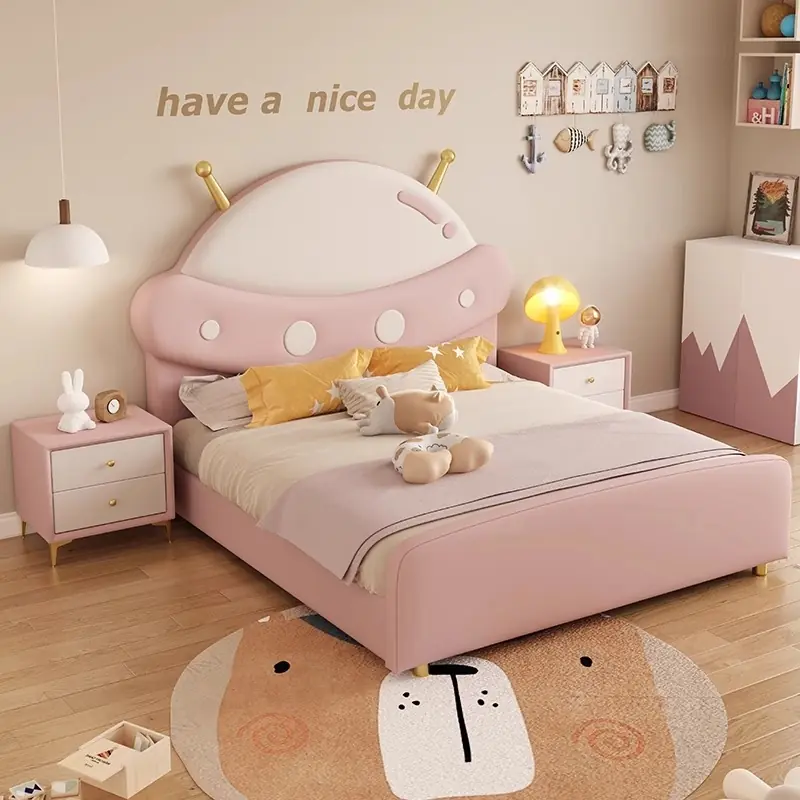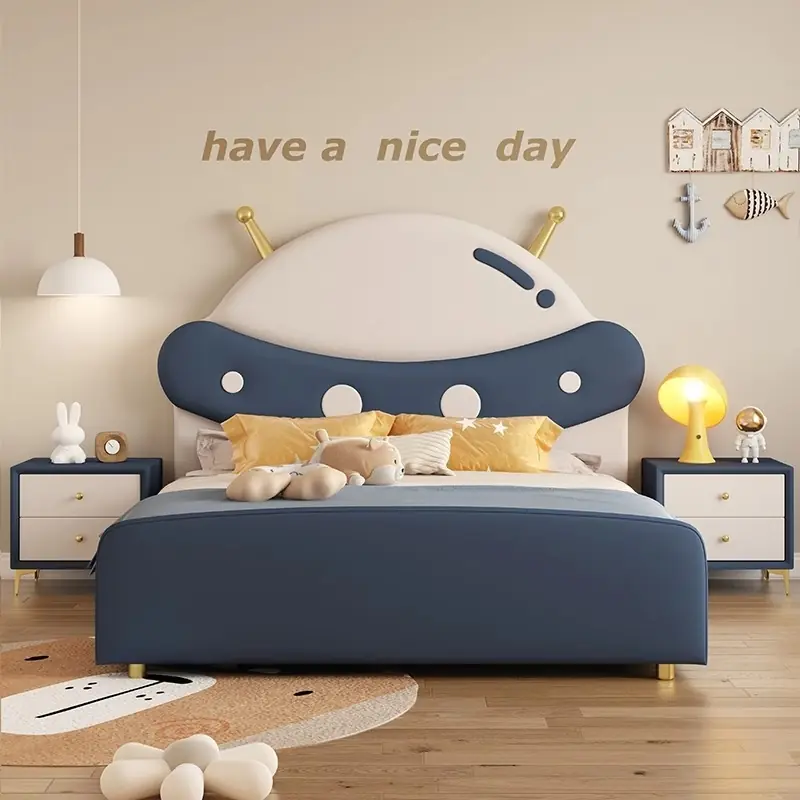 Mẫu giường ngủ trẻ em hình UFO mang phong cách hoạt hình hiện đại, tạo cảm giác mới mẻ và đầy hứng thú cho không gian phòng bé. Thiết kế đầu giường tạo hình UFO ngộ nghĩnh, các đường cong bo tròn mềm mại giúp chiếc giường vừa nổi bật về thẩm mỹ vừa thân thiện với sinh hoạt hằng ngày của trẻ nhỏ.