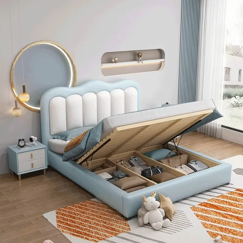 Giường được hoàn thiện từ khung gỗ tự nhiên chắc chắn, bên ngoài có thể lựa chọn bọc da hoặc nỉ cao cấp. Bề mặt bọc mềm mại, tạo cảm giác êm ái khi bé tựa lưng, nằm nghỉ hoặc vui chơi trên giường.